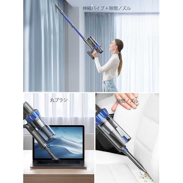 【長さ調整可能で身長問わず・1台多役・豊富なキット付き】この掃除 機は11段階で伸縮可能の延長パイプを採用しており、長さ(伸縮パイプの部分)は41cmから65.5cmまで調整可能です。身長合わせてパイプが自由に調整でき、身長を問わず快適に使えます。伸縮パイプとブラシヘッドの以外にも、隙間ブラシも付属しており、使用場所に応じて対応できます。スティッククリーナーとしてだけでなく、伸縮パイプとブラシヘッドを外して隙間ブラシを本体に取り付けば、車用掃除機やハンディクリーナーなどとしても使用できます。