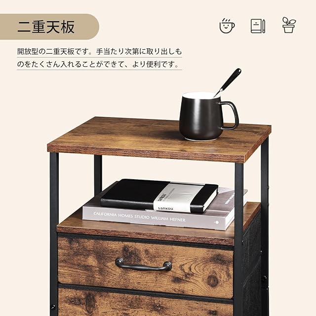 【二つの引き出し】この収納付きテーブルをソファやベッドの横に設置すると便利になります。引き出しが2つあるので、あまり使わない物や小物を入れることができます。ホコリを防ぐだけでなく、物を収納でき、部屋が散らかって見えなくなります。