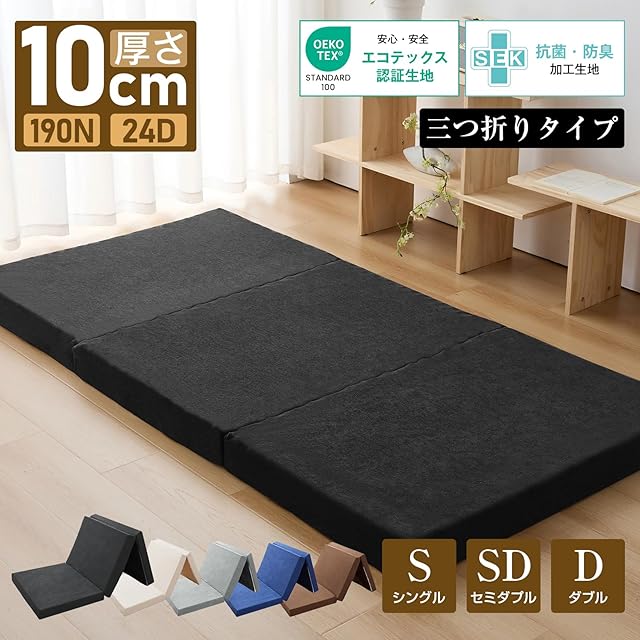 マットレス シングル 三つ折り 極厚10cm 硬さ190N 24D高密度 折り畳みマットレス 凸凹加工 体圧分散 抗菌防臭 高反発 敷布団 タオル生地 洗えるカバー 通気性がよい 97x195x10cm ブラック