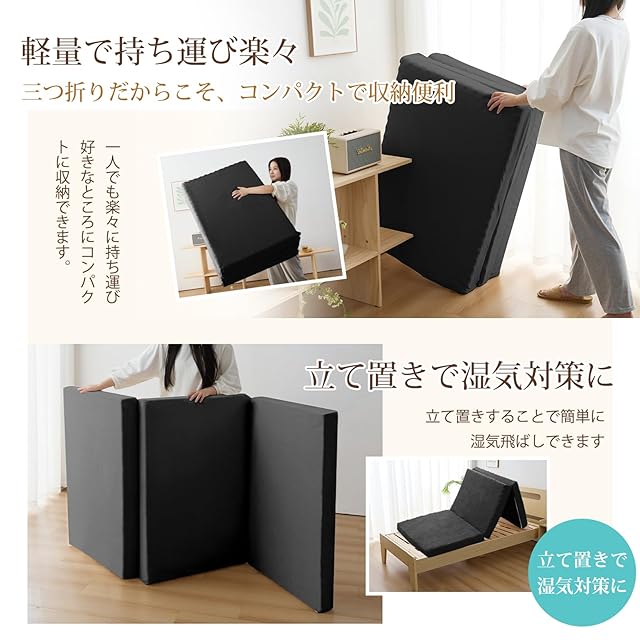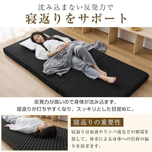 【商品仕様】三つ折りタイプ 【サイズ】97cmx195cmx10cm(シングル) 【色】ブラック 【洗えるカバー】シンカーパイル & メッシュ(ポリエステル100%) 【中材】高反発ウレタンフォーム(密度24D、190N) 【ご注意】開封後すぐは、ウレタン特有のにおいがする場合がございます。人体に影響はありませんが、気になる場合は風通しの良い場所で陰干しして頂くことで、通常より早くにおいが消えます / 開封後に商品のしわが戻りにくい場