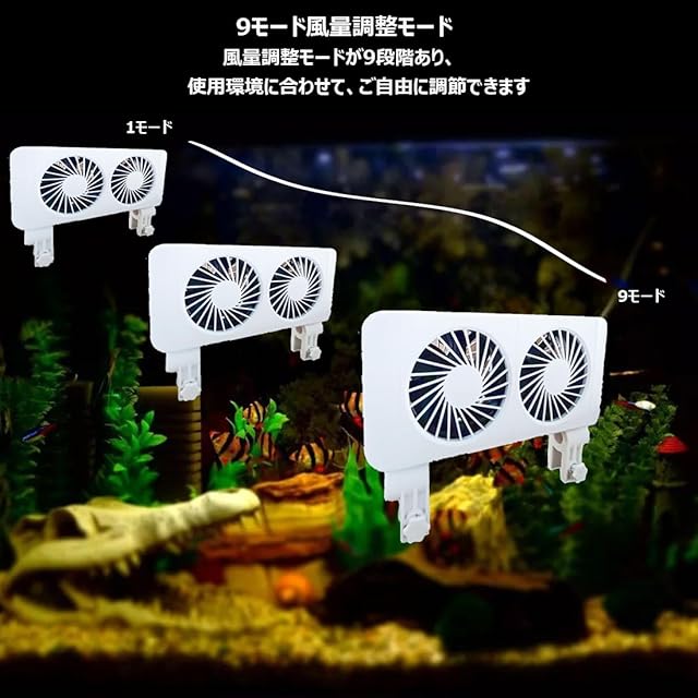 水槽 ファン 冷却 クーラー コントローラー付きの水槽 クーラー ファン、9段階風量調整可能、夏水温上昇防止に不可欠なクーリングファンです、取り付け簡単で、固定クリップで13mm以下のガラス厚さに対応できます。