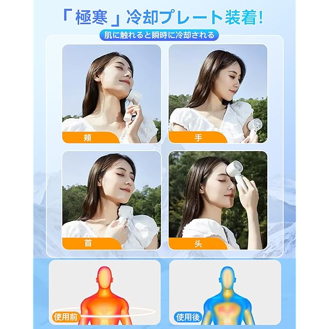 【2025新登場! 瞬間冷却ハンディファン】この新登場の冷却プレート付き扇風機は、3秒間長押しすると冷却モードを始め、氷のような触感を実現します、-18度まで。冷却プレートを首や手首などに当てるだけで、一瞬で温度を下げることができるため、真夏の熱中症対策として最適です。職場、学校、図書館、花火大会、お祭り、スポーツ観戦など、暑い日のさまざまなシーンで活躍する。熱中症対策に最適な携帯扇風機です。