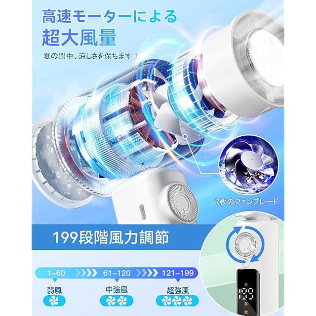 【199段階自由調節・角度調整可能】手持ち扇風機は超高性能モーターを搭載し、コンパクトで持ち運びが簡単でありながら、大風量が得られます。このハンディファンにも使われる超高速回転モーターと。1-199段階風量調節により、自然に近い優しい風からパワフルな超強風まで細かく切り替えることが可能。屋外の強い日差しの下でも涼しさを保つことがされたこのハンドヘルド・ファンは、アウトドア・スポーツ愛好家にとって本当にありがたい。また、本携帯扇風機の底部には滑り止め素材が採用されて、卓上扇風機として安定に置くことだけでなく、角度も調整することができ、手に持って疲れたらいつでも両手を解放することができます、どちらでも簡単に風を当て夏の涼しさを楽しめます。