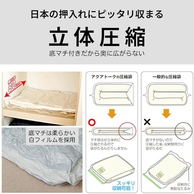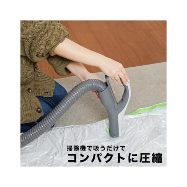 <b>【大型圧縮袋】</b><br>シングルサイズの掛布団、敷布団を一式まとめて圧縮できる圧縮袋です。布団を入れると縦方向に立ち上がる底マチ付き圧縮袋なので大容量です。<br><br><b>【薄型逆流防止弁付きバルブ】 </b><br>厚さ11.5ミリの超薄型バルブだから圧縮しても盛り上がることがなく、重ねて収納する時も邪魔になりません。<br><br><b>【空気が逆流しない簡単圧縮袋】</b><br> バルブの中の逆流防止弁の働きで、掃除機のノズルをはなすと自動的に空気の流れが止まります。吸引時の逆戻りで失敗することがないので、簡単、確実でしかも清潔です。<br><br><b>【安心で使いやすい高密封チャック】</b><br>空気のモレが起こらないように、チャックは気密性の高い高密封構造です。開けやすいようにつまみ部分にはグリップと段差があり、しかも見分けやすい色違いになっています。<br><br><b>【サイズ】</b><br>(幅)130cm×(深さ)85cm×(底マチ)56cm <br><br><b>【材質】</b><br>(本体)ナイロン / ポリエチレン(バルブ)ポリエチレン / ポリウレタン(スライダー)ポリスチレン <br><br><b>【原産国】</b><br>日本