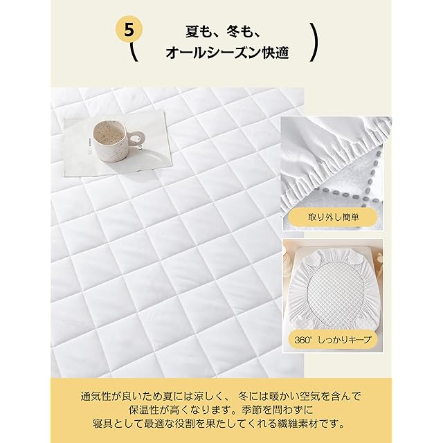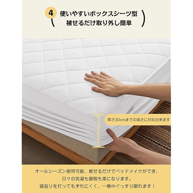 【全周ゴムで簡単フィット】360°しっかりキープ、被せるだけで簡単に装着することが可能。厚さは30cmまで対応なので、マットレス/敷布団にもしっかり固定でき、寝返りしてもズレにくいです。