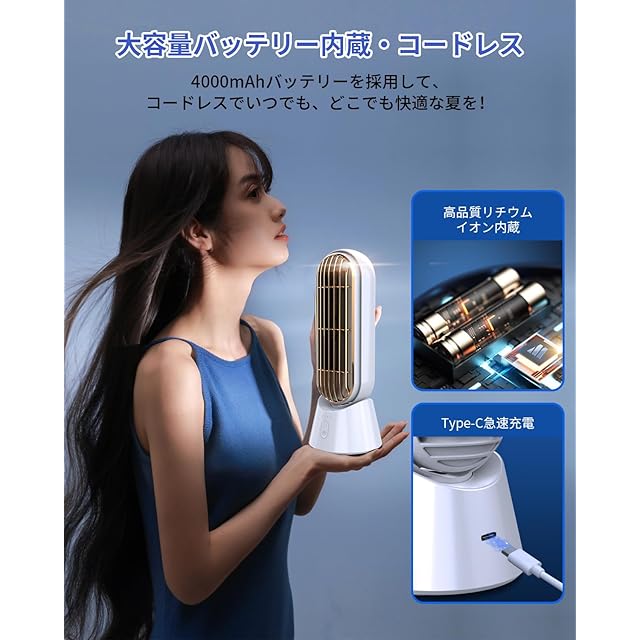【大容量バッテリー内蔵・コードレス】4000mAh大容量バッテリーを内蔵しており、フル充電して、最大約10時間の連続稼働ができます。また、USB充電式なので、ACアダプター、モバイルバッテリーなどを利用し、手軽に充電ができます。コードレスでいつでもどこでも心地よい風を楽しめます。