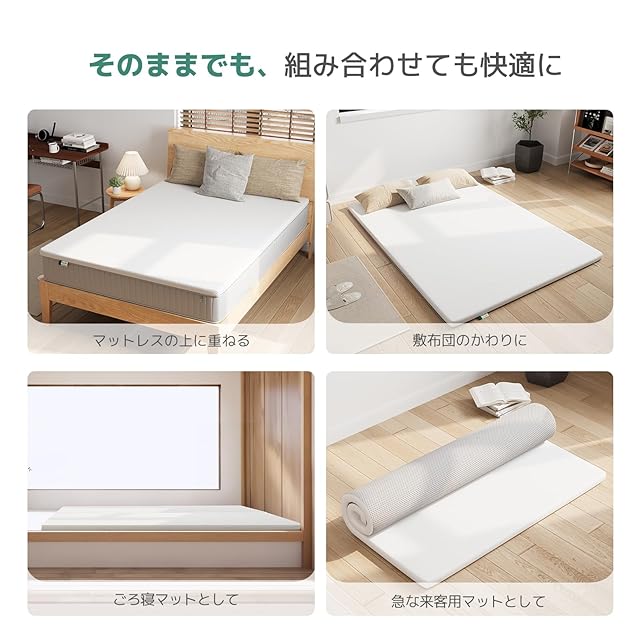 【収納バンド付き、収納・持ち運び便利】収納バンド付きで、収納や持ち運びもラクラク。使わない時は2Wayでコンパクトに収納できます。一時的に収納する場合は、マットレスを丸めてバンドで固定し、壁際に立てかけられます。長期間使用しない場合は、四つ折りにしてバンドで固定すれば、クローゼットにコンパクトに収納可能です。軽量設計で、女性でも楽に持ち運べます。