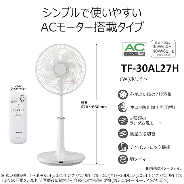 TOSHIBA(東芝) リビング扇風機 TF-30AL27H 7枚羽根 風量3段階 リモコン付 ホコリ防止加工 ACモーター 切タイマー
