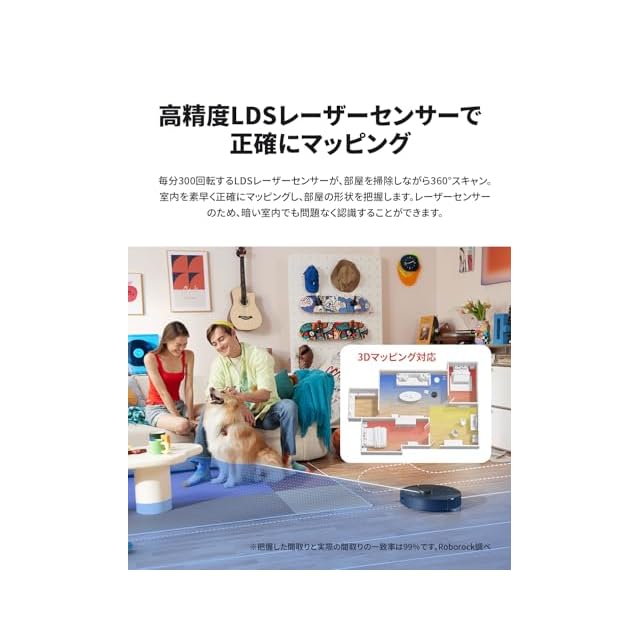 【高精度マッピングで効率的なお掃除】ロボロック社独自のPreciSenseLiDARナビゲーションによって部屋の環境を賢しく学習し、間取りを素早く正確※にマッピングできます。清掃ルートや家の構造は、アプリのマップ機能で自動的に生成されます。往復回数が最少になるように走行し、 短時間で効率よく隅々まできれいに掃除します。暗い室内でも問題なく認識できます。※把握した間取りと実際の間取りの一致率は99%です。Roborock調べ