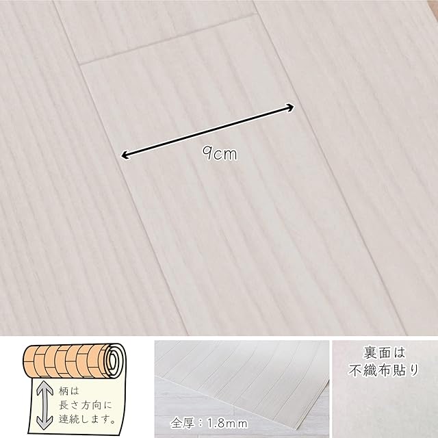 優しい色合いの、ホワイト系アイボリーの木目柄。清潔感の中にも温かみがあり、お部屋が広く明るくなります。板幅は約9cm。水や汚れに強く、リアルな質感を感じられる、おしゃれな床保護リメイクシート。汚しても拭くだけのかんたんお手入れ。適度なクッション性で床を傷から保護。リビングのフローリング、キッチンや洗面所などの水回り、玄関などの床を簡単にリメイクできます。