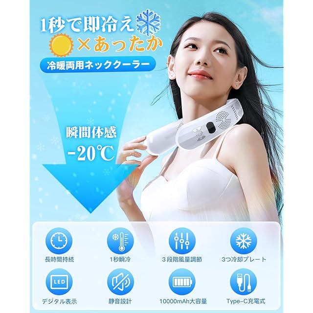 商品名:Azidxu ネッククーラー 首掛け扇風機 ネックファン 【2025最強進化上下送風】 風量3段階調節 3つの冷却プレート搭載 ネッククーラー 冷却プレート Type-C充電 10000mAh大容量バッテリー 最大24時間連続使用可能 冬夏兼用 LEDディスプレイ表示 熱中症対策 スポーツ観戦 遠足 自宅 アウトドア 山登り 工事現場 通勤通学 釣り 夏の暑さ対策に最適 (ホワイト)
