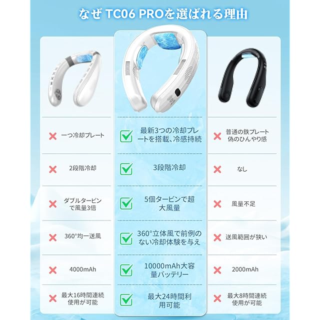【3つの冷却プレートで1秒でひんやり】 体感温度-19℃を実現 !このネッククーラーは、左右2つの冷却プレートに加え、業界最大サイズの首元冷却プレートを搭載。わずか1秒で瞬冷し、体感温度を最大19℃下げることで、灼熱の夏でも快適に過ごせます。従来の首掛けファンとは違い、「風を送る」だけでなく「直接冷却」するので、真夏の外出やアウトドアでも猛暑をシャットアウト!