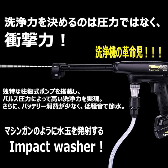 YOIbuy PRO が開発した新製品 充電式インパクト洗浄機 独自なパルス噴射技術でただの吐出圧力ではなくパルス噴射によるインパクト(衝撃力)で洗浄する新発想! 「洗浄力をきまるのは圧力ではなく、衝撃力!」 同価格帯のハンディ洗浄機では驚くほどな洗浄力を実現、最強コスパの洗浄機。