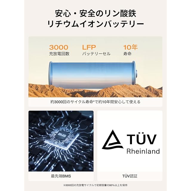 【約6倍長寿命・安全なリン酸鉄リチウムイオン電池採用ポータブルバッテリー】 ポータブルバッテリーRIVER 2 Proには、電気自動車にも使用されているリン酸鉄リチウムイオンバッテリーが搭載されています。バッテリーの充放電を繰り返し行える回数が、業界平均500回に対して、RIVER 2 Proは6倍の約3,000回です(初期容量の80%以上を維持)。1日1回使用しても、約10年以上も使用することが可能です。また、リン酸鉄リチウムイオンバッテリーは、環境に有害な金属を使用しておらず、耐熱性にも優れており、RIVER 2 Proポータブル電源は、高温下などの厳しい環境においても使用することができます。ポータブル電源業界では初となる、世界トップクラスの製品安全機関テュフ ラインランド社の認証を取得。