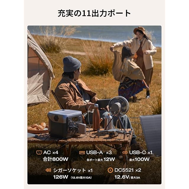 【日常、レジャーから緊急時までこれ1台で電力がまかなえるぽーたぶる電源】 RIVER 2 Proぽーたふる電源は、バッテリー容量768Wh、定格出力800Wのパワフルなポータブル電源です。ACx4、USB-Ax3、USB-Cx1、DC5521ポートx2、シガーソケットx1の合計11個の出力ポートが搭載されています。スマートフォンや電気毛布、冷蔵庫、テレビ、パソコン、プロジェクター、扇風機など、幅広い電化製品をコンセントのない場所からでもご使用いただけます。非常用電源としても人気の機種です。