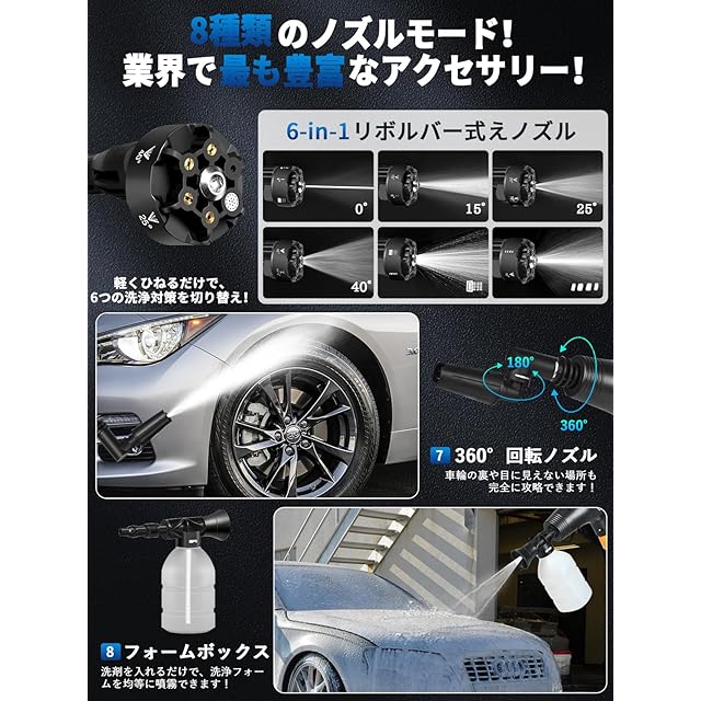 ✨【便利な付属品セット!プロ仕様8in3・フォームボトルで多用途清掃】使いやすさを追求したフル装備の収納セットを提供。ワイヤレスで携帯性が高く、収納ケースごと持ち運べるので、野外でも簡単に洗車可能。6-in-1多機能ノズルは0°、15°、25°、40°、扇形、シャワーの6つの角度を提供し、車の表面の汚れを効果的に洗浄。360°回転と180°調整可能なノズルで、車輪などの細部も楽に清掃。付属のフォームボトルを使えば、洗剤を車全体に瞬時に広げることが可能。市販洗浄剤の99%に対応。多機能なデザインで1台でさまざまな用途を実現し、家庭の日常清掃をさらに簡単かつ便利にします。