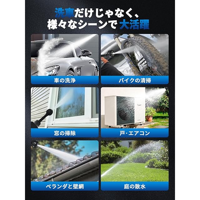 商品名:高圧洗浄機 コードレス 充電式 【2025新登場強化版・バッテリー2個・プロ洗車店監修】20000mAh 8MPa マキタバッテリー互換 PSE認証済み 噴射距離13M LCD残量表示 750W自吸式 6in1ノズル(360°・フォーム)付き コンパクト収納ボックス 洗車 庭 ベランダ 網戸 外壁 玄関 園芸用品 家庭用