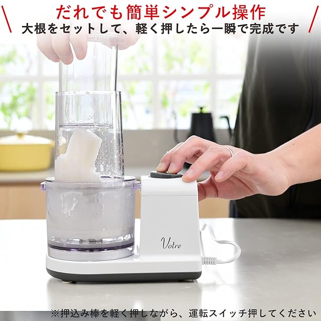 【簡単操作】大根をセットして、押込み棒をやさしく押し込みながら運転スイッチを押すだけ。初めての方でも簡単に使えるシンプル設計。