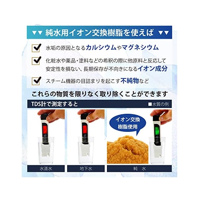 【ご使用条件】ご使用の純水器のサイズやイオン交換樹脂量に対して、過剰な流量で通水した場合は純水が採水されない場合がありますので、適切な条件でのご使用をお願いいたします。最高使用温度:60℃・最供給水流量:20-40BV / hr ※1BV(BedVolume)=1 (処理液m3 / 樹脂量m3)