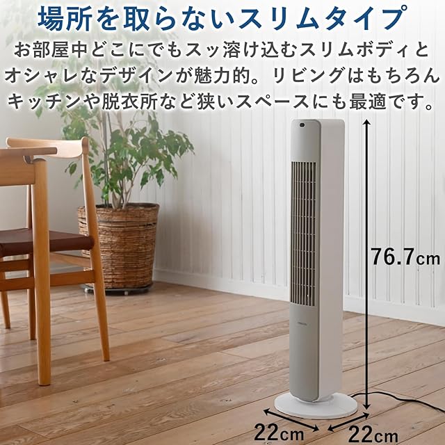 【タワーファン】省スペースで設置できるスリムなタワーファン。お部屋中どこでもスッと溶け込むスリムボディでリビングはもちろんキッチンや脱衣所などちょっとしたスペースで使用できます。