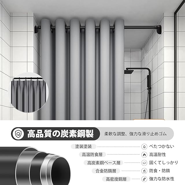 【 内容 】つっぱり棒130~450cm , カーテンリング20個を含む ブラック, この製品は旧モデルをベースに改良されており、美しい外観と,高い耐荷重性、 さまざまな場所で使用でき、同時に再利用できます ,棒に穴がなく、完全に防水防錆することができます。