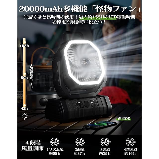 【20000mAh「怪物ファン」!驚いた稼働時間】「怪物」のような強い機能性☆彡2024年新登場のIssufel キャンプ 扇風機は20000mAhの超大容量バッテリーを搭載しており、フル充電の場合、ファンモード1で稼働時間は65H!LEDライトで最大稼働時間は驚異の155H!長期間の使用やアウトドアでの活動に便利し、連続して風を楽しみます。コードレス・充電式扇風機はコンパクトで、収納可能な取っ手も追加し、楽々持ち運びられます。室内はもちろんキャンプや車中泊などの屋外でも活躍します。キャンプ 扇風機は「出入力ポートやLEDライトも付いているので、停電や緊急避難時や災害時においても役立ちます。1台で多彩な用途に対応します。