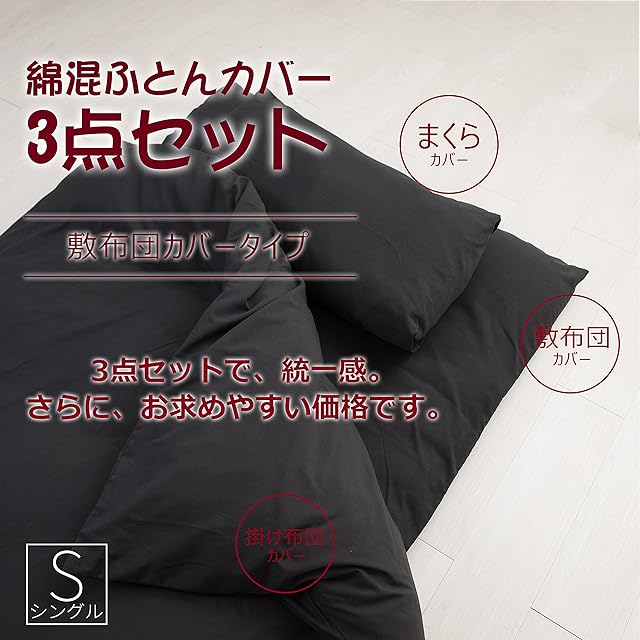 和式 布団カバー シングル 3点セット 綿混 無地 寝具カバー3点セット 掛け布団カバー 敷き布団カバー 枕カバー 洗い替え 防ダニ(ブラック)