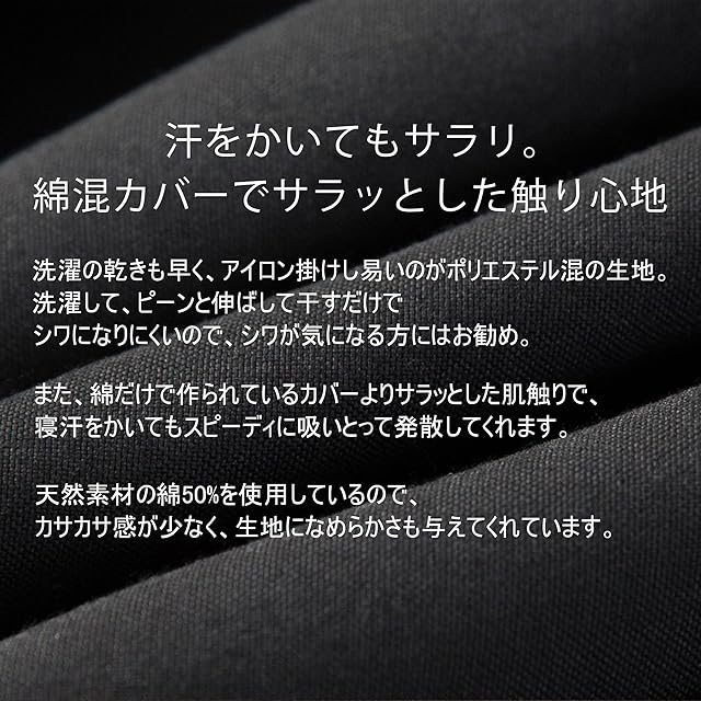【綿混生地・快適】: 綿50%とポリエステル50%の混紡系なので、速乾性に優れ、乾きが早いからお洗濯も楽々!お洗濯の後シワが付きにくいから手入れも簡単!だからいつでもカバーは清潔に毎日快適に眠れます。きめ細やかな「ピーチスキン加工」なので、すごく柔らかくて肌触りがよいです。無臭無毒で、子供でも楽に使用できます。