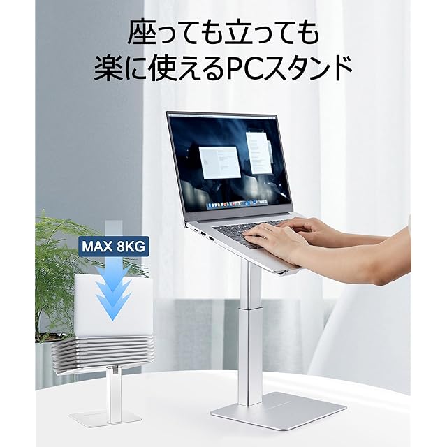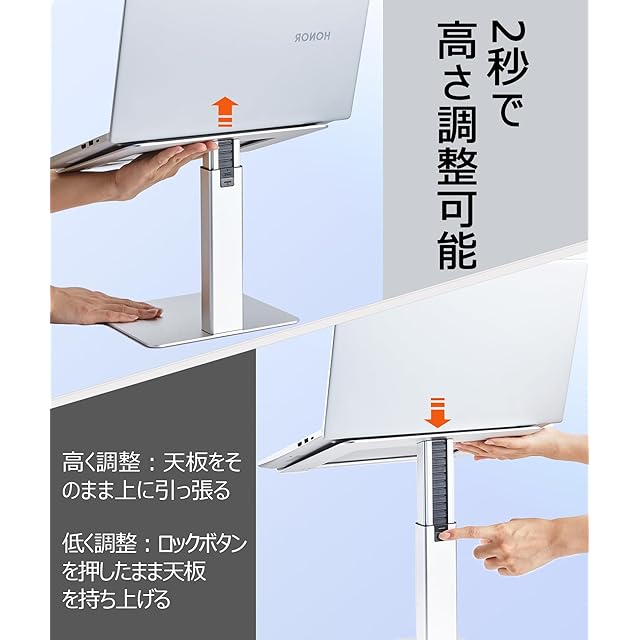 Supamir 座る立つ両用のpcスタンド 肩凝り、首の痛みを軽減、健康な姿勢で作業をサポート。アルミ合金製、13ー16.5インチのpcに適応、底面から20~38cm迄、16段階で高さ調整可能。安定性抜群、タイピングする時にガタガタしない、天板、底板に滑り止めパッド付き、組立用の六角ドライバー付き、下部に収納スペースあり、艶消しアルマイト処理、グレー、シルバー、黒3色有り、テレワーク、jd、リモート授業、キッチンに利用可能