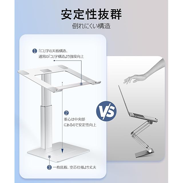 【アルミ製・安定構造・滑り止めパッド付き】人間工学に基づき、Supamirノートパソコンスタンドは「コ字型」の構造を採用し、重心は中央部にあり、最大荷重約8.0㎏、抜群の安定性を実現しています。天板の角部4箇所、底板4箇所に、高品質のシリコン製の滑り止めパッドが配置されて、PCをしっかり固定するので非常に使いやすいです