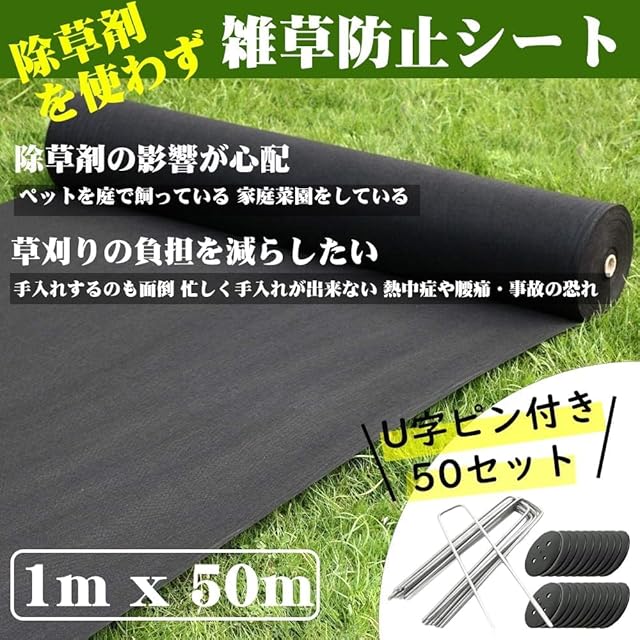 【商品仕様】防草シート 不織布:1 m x 50 m、重さ:約5500 g。固定ピン50本と黒丸50枚付き組み合わせて、より簡単に設置することもできます。スチール製ピン杭は表面に亜鉛メッキ加工を実施されたなので、腐食や錆びが起こりにくいです。防草シート 両面使用可能