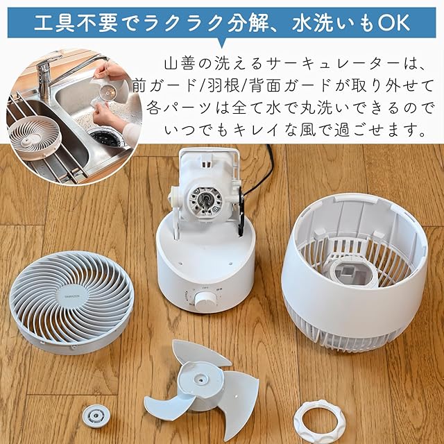 【簡単分解お手入れ】工具不要で前面ガードと羽根、さらに裏面ガードまで取り外しでき、お手入れがしづらいガードの隙間や羽根の裏側なども、簡単にお掃除をすることができます。さらに、前面ガード・背面ガード・羽根は取り外した後、丸洗いが可能です。