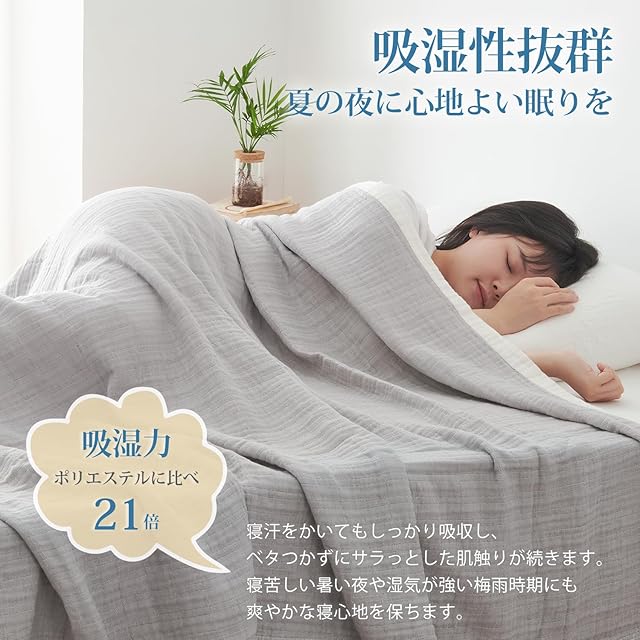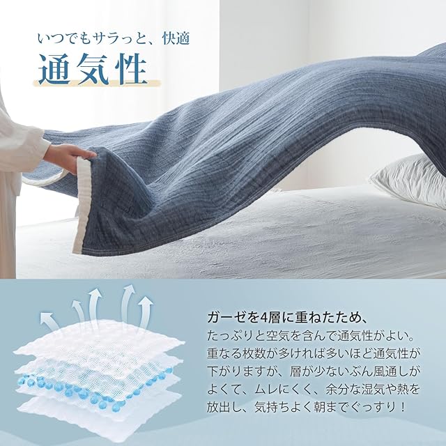【吸湿性・通気性で寝心地よい】ガーゼ生地は優しい肌触りだけではなく、吸湿性・通気性がよいため、寝汗をかいても素早く吸収してムレにくく、不快な熱や湿気を外に逃がし、より爽やかな寝心地を実現できます。また、ガーゼの中の空気層が体温を留め、寝冷えしない暖かさを保ちます。