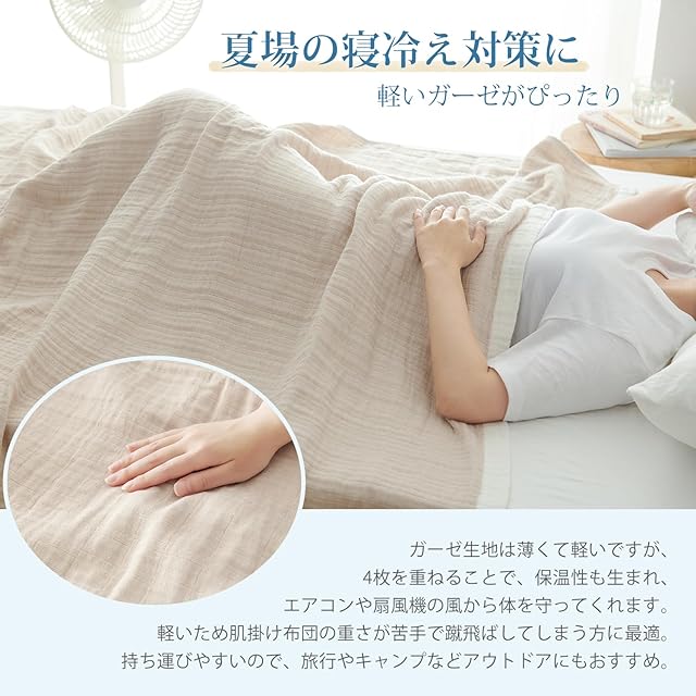 【一年中使える快適さ】4重ガーゼの優れた特性によって、一年中気持ちよくお使いいただけます。暑い夏は1枚で涼しく快眠環境を作ります。少し肌寒い時期は、お昼寝ブランケットにしたり、ひざ掛けや肩掛けにしたり、室内の寒さ対策としても最適。冬場は中掛布団として、ムレ感を抑え暖かくご使用いただけます。