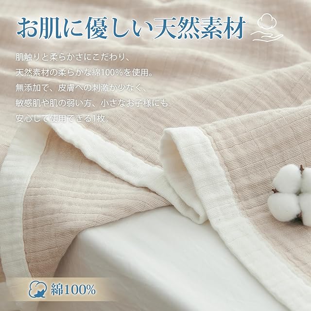 【お肌に優しい天然素材】綿100%のガーゼ生地を採用したガーゼケット、どこに触れても柔らかくて肌触りがよく、肌の弱い方、敏感肌の方も安心してお使いいただけます。耐久性にも優れており、使うほど肌に馴染み、長持ちできる一枚。