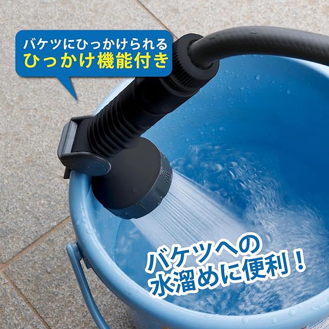 【バケツへの水溜めラクラク】ノズルの上部にひっかけ機能が付いていて、バケツへ固定して水を溜めることができます。