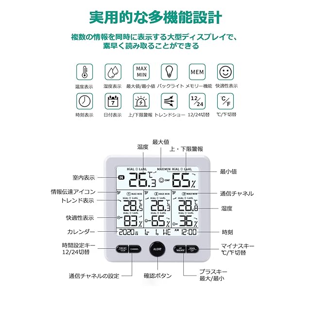 【複数データ表示】:大型液晶画面に時刻、カレンダー、曜日、室内/室外湿度/温度、温度/湿度の傾向、快適度などを同時に表示し、最高・最低温湿度を記録します。 より見やすくなりました。摂氏と華氏の表示切替が可能。温/湿度計デジタルシステム内に存在する可能性のあるドリフトを考慮した温度と湿度の校正機能を備えています。