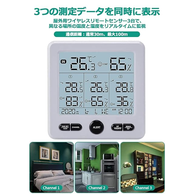 【室内屋外兼用&三個子機センサー】:屋内外用リモートセンサー、防水ではなく、最大通信距離100m、有効距離30m。子機センサーを利用して4ヵ所の温湿度の測定値を自動的に親機へ送信します。家族の健康管理に、インフルエンザや風邪な どの予防対策に、お部屋の乾燥チェックでお肌の潤いを保つのに、他にも、カビ対策や熱中症対策などに役立ちます。