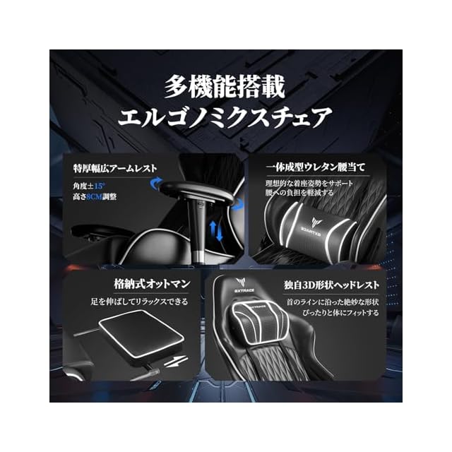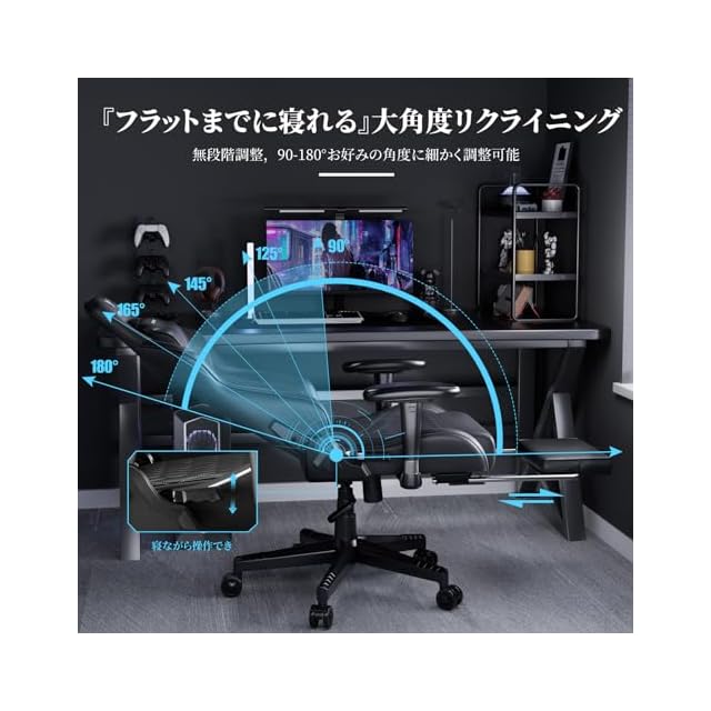商品名:GXTRACE ゲーミングチェア オフィスチェア ゲームチェア オットマン付き 人間工学 165度リクライニング ハイバック テレワーク椅子 PCチェア (1-Black, ヘッドレスト強化)