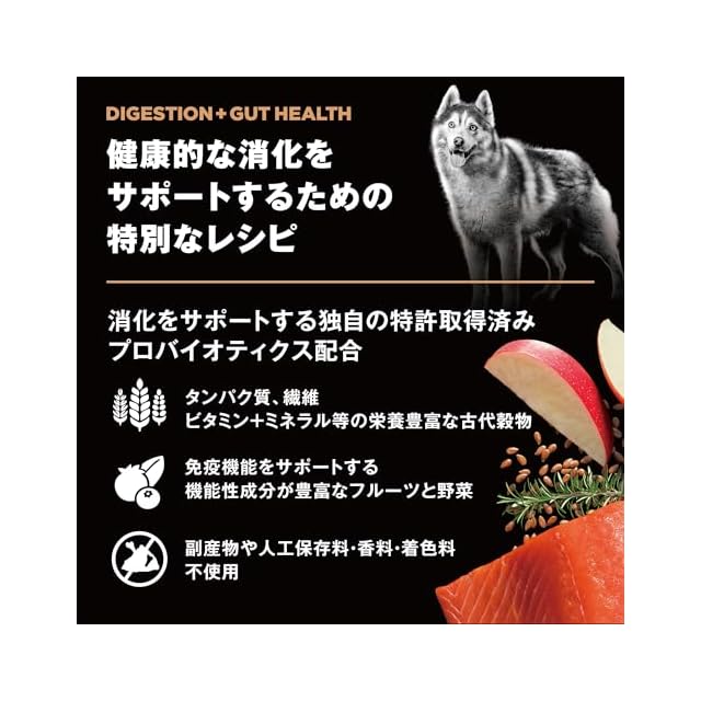 【消化サポート・腸の健康をケア】犬の健康に不可欠な消化器系の健康ケアをするために作られた古代穀物を使用した特別なレシピ。腸内環境を整えたい、お腹の調子を安定させたい、消化器系のケアがしたい。そんなお悩みに。