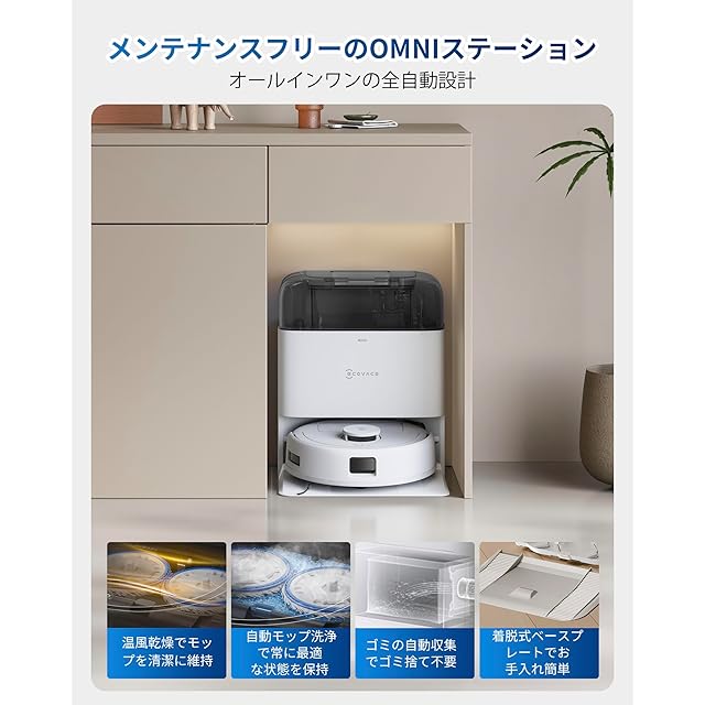 【コンパクトで多機能なOMNIステーション】ステーションは高さわずか38.5cmの省スペース設計ながら、最先端の掃除技術を搭載。45℃自動熱風乾燥機能で雑菌やニオイを防ぎ、清潔さを保ちます。さらに自動ゴミ集塵機能により、手間なくゴミを処理可能。全自動洗浄機能でモップのメンテナンスも簡単に。ディープモッピング機能は頑固な汚れをしっかり落とし、効率的かつ丁寧な掃除を実現します。