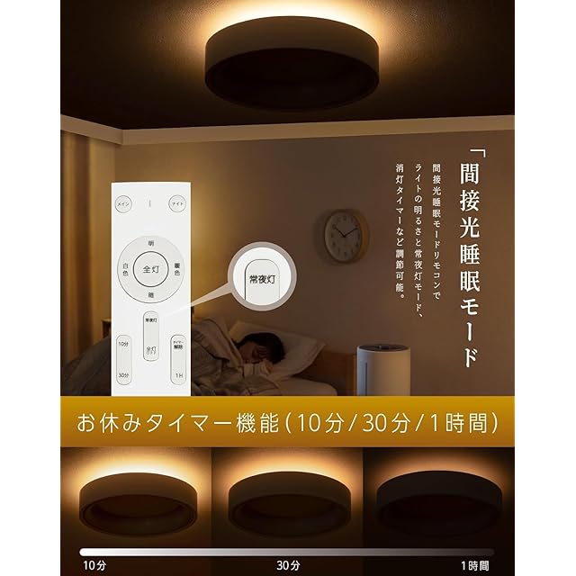 【便利なリモコン操作とタイマー機能】リモコンで簡単にオン・オフや色温度の調整が可能。明るさと色温度は10段階で調整でき、スムーズに切り替えが可能です。タイマー機能には10分、30分、1時間の設定があり、就寝前や外出前の設定に便利で消し忘れを防ぎます。フルライト、ナイト、ミドルライトの3つのモードで、日常生活のさまざまなシーンに合わせて照明を調整できます。
