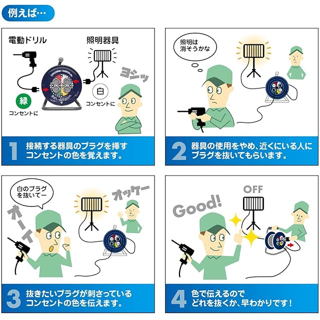 【特徴】雨や水がかかる場所でも安心安全の屋外用防雨型コードリール。コンセントの防雨・防塵キャップは開閉しやすい一体成型。プラグがどのコンセントから電源を取っているか一目でわかる表円盤シールラベル仕様。使用中のコンセントが分かりやすいよう4つのコンセントに色を設定。