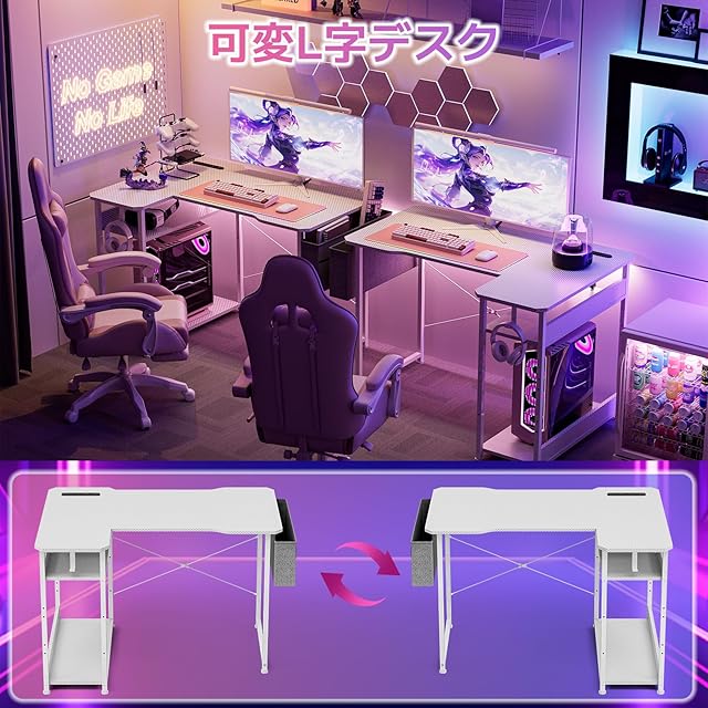 商品名:Acrolix ゲーミングデスク L字 左右入替OK 収納バッグ付き コンセント付き ホワイトカーボン調天板 奥行70cm 幅100cm 棚高さ調節可能