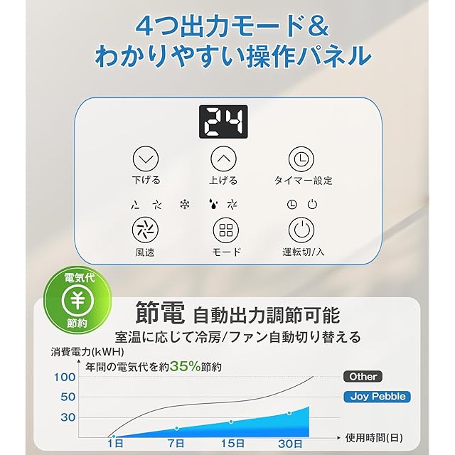 商品名:Joy Pebble スポットクーラー 2.0kW 6-8畳対応 エアコン 工事不要 冷房/除湿/送風 2階段風量送風 24時間タイマー おやすみモード 省エネ 移動式エアコン 暑さ対策 冷房機 ノンドレン 排熱ダクト リモコンつき 日本語取扱説明書