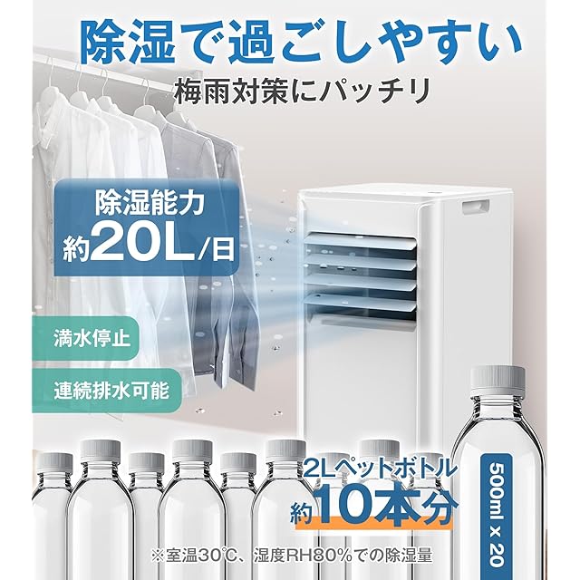 【3つのモード・ノンドレン構造】Joy Pebbleスポットエアコンは冷房/除湿/ファン3つのモードを備え、多様なニーズに応えて快適な室内環境を作れます。ノンドレン構造のゆえ、冷風・ドライ時の排水を内部で蒸発させるから水が出ません。面倒な水捨てもいらず、手軽に使えます。1日約20Lの除湿性能もあり、部屋の湿気を取り除いて、梅雨時期は配属の排水ホースにより簡単に連続排水でき、内蔵水タンクに溜まった水を捨てに行く手間が省けます。