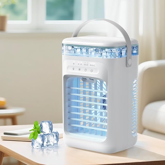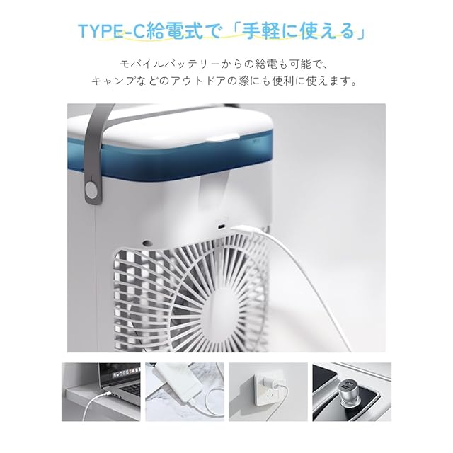 【1台多役・送風・急速冷却・加湿・浄化効果冷風機】 送風・加湿・冷却・浄化効果が一体化となって卓上冷風扇です。この小型冷風機の送風は扇風機のより涼しい、エアコンより寒くない。見えないほどの超繊細なミストも噴出されて加湿効果もあり、お肌に水分を補給します。十分な風量を確保しながらエアコンの涼しく快適な体験と加湿器の保湿効果を実現し、クーラーが苦手な方や、乾燥が気になる方にお勧めです。