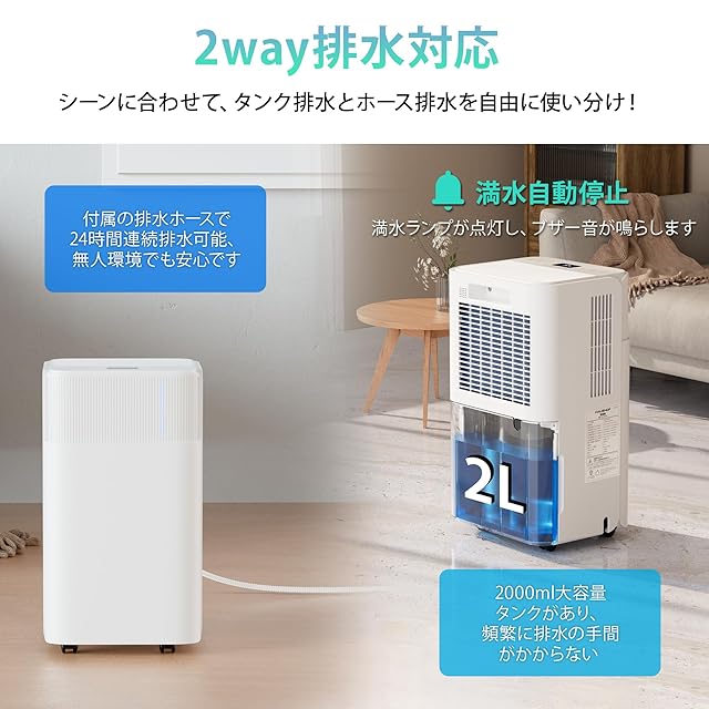 【2Way排水対応&お手入れ簡単】タンク排水とホース排水の2Way排水に対応し、用途や環境に合わせて自由に使い分け可能。取り外しが簡単な約2000mlの大容量タンクで排水の手間を軽減します。付属の1m排水ホースを使えば24時間連続排水ができ、無人環境でも安心して使用します。満水自動停止機能も搭載し、こまめな水捨ての手間が不要です。
