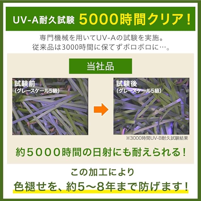 【素材】芝:ポリエチレン、芝葉形 :C型、ポリプロピレン 土台:ポリプロピレン、ラテックス 芝葉目付数(密度)/47万本m2