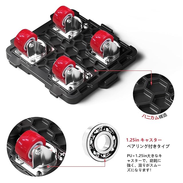 ローラー:360度回転(ベアリング 自在 キャスター)&静音(柔らかいゴムで作られる);柔らかくで、弾力性がありますので、床を傷める心配がありません;台車耐荷重:1台あたり75KG、セット(4台)300 KG。